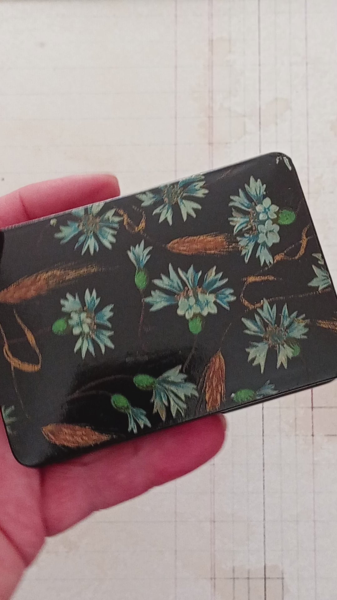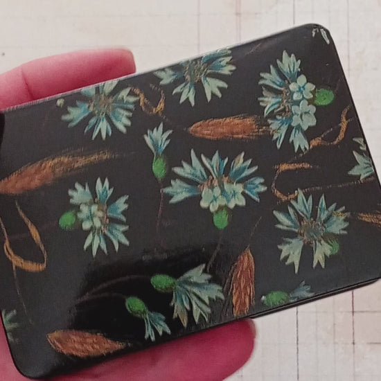 This is a stunning little trinket box from the Victorian era. It is black papier mache with stunning hand painted decoration to the top and sides of cornflowers and wheat sheafs in blue and gold. It has a hinged top which opens nicely to reveal a number of small compartments, so perfect for little pieces of jewellery. It has minor wear to the paint and is a gorgeous original piece and in lovely antique condition. It measures 3.6 inches by 2.4 inches and is 1 inch high.